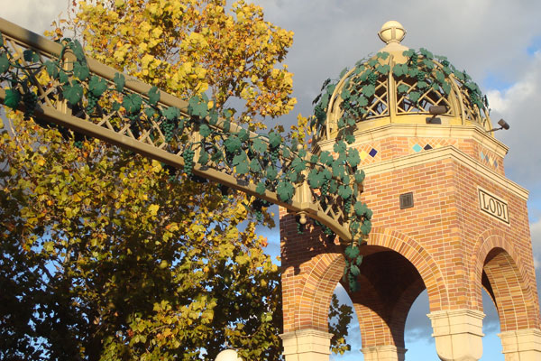 Grape leaves twine around an arch in downtown Lodi, California.